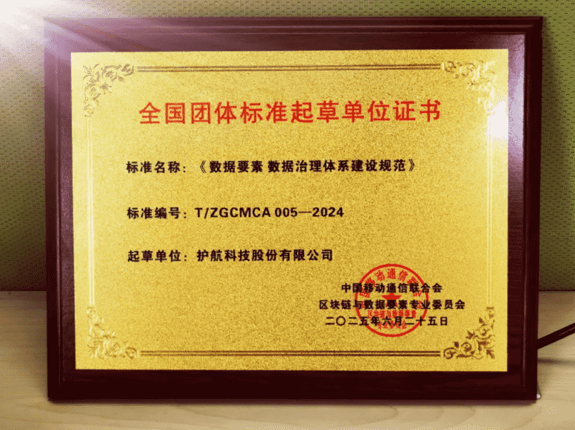 护航科技深度参与国家数据治理标准,赋能“数据要素×”行动落地护航科技正式获颁《数据要素 数据治理体系建设规范》全国团体标准起草单位证书。2025-06-30