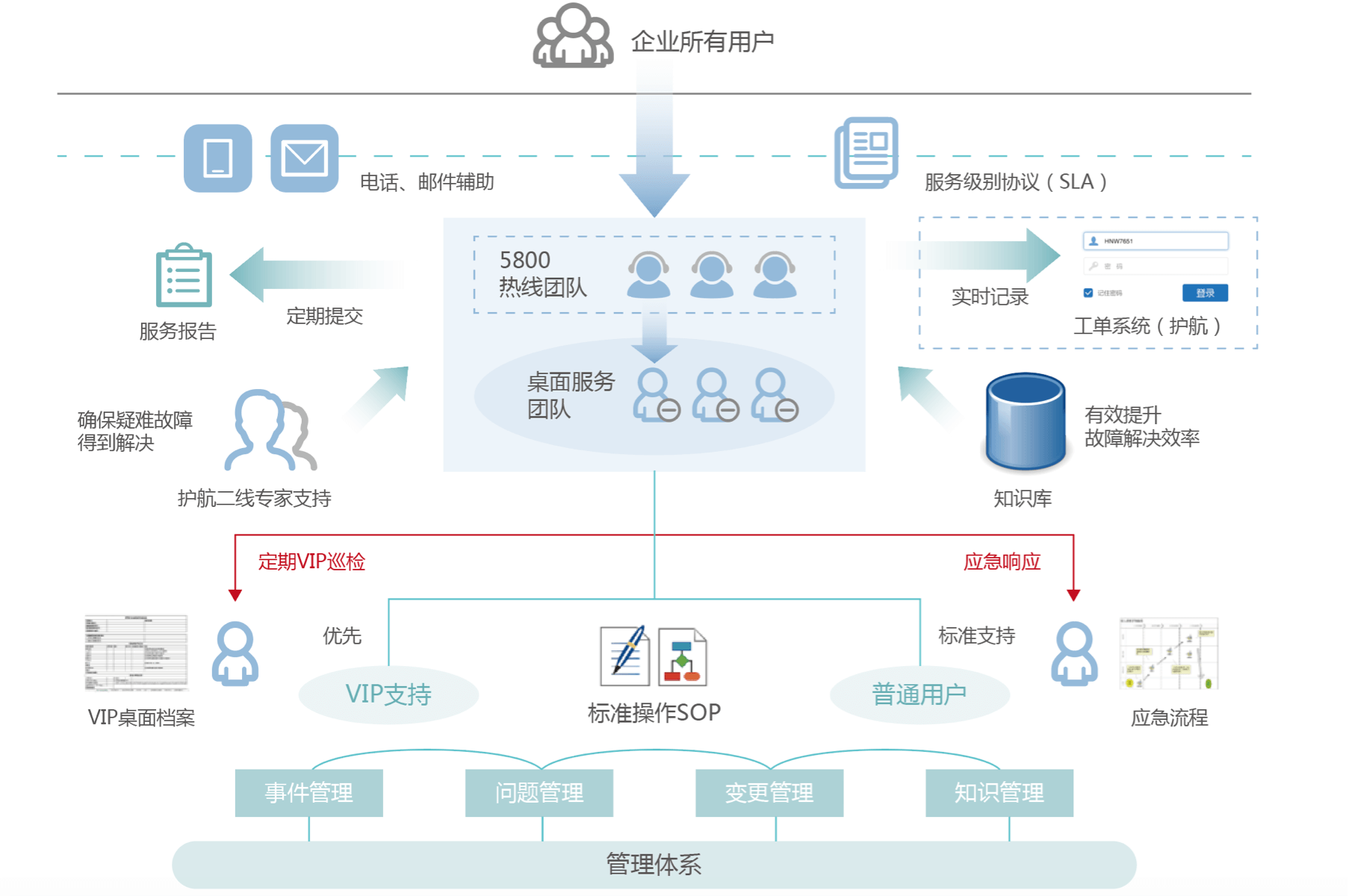 根据该企业桌面运维服务外包的特殊性及本次项目需求特点,护航结合以往典型客户服务经验,在运维过程中着重关注以下几个方面: